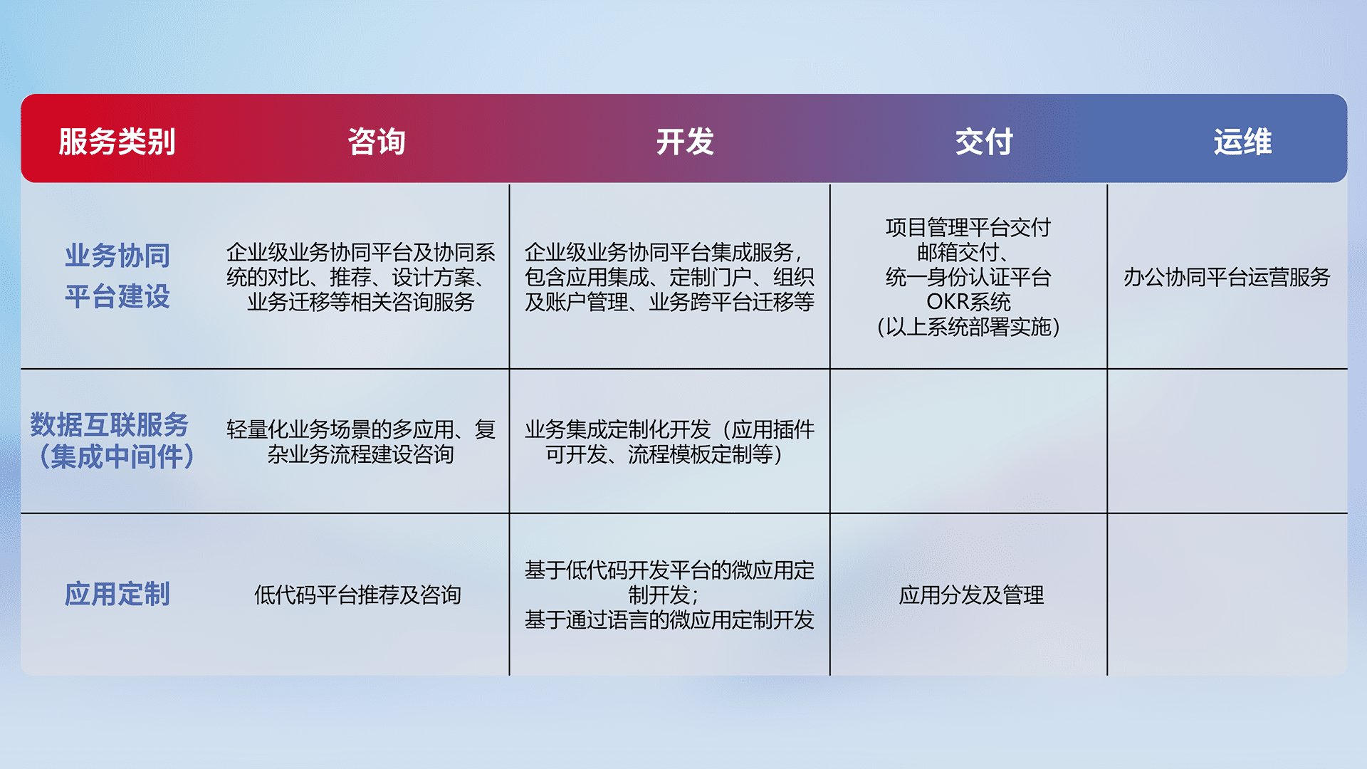 针对钉钉、、企微、、IDaas等平台级产品提供产品的规划、、、、方案、、交付、、、定制化开发等服务,,,实现如统一协同办公、、、智能客户服务、、、混合会议管理、、、、智能数据查询、、、、等业务场景,,,实现数字化转型。。。。